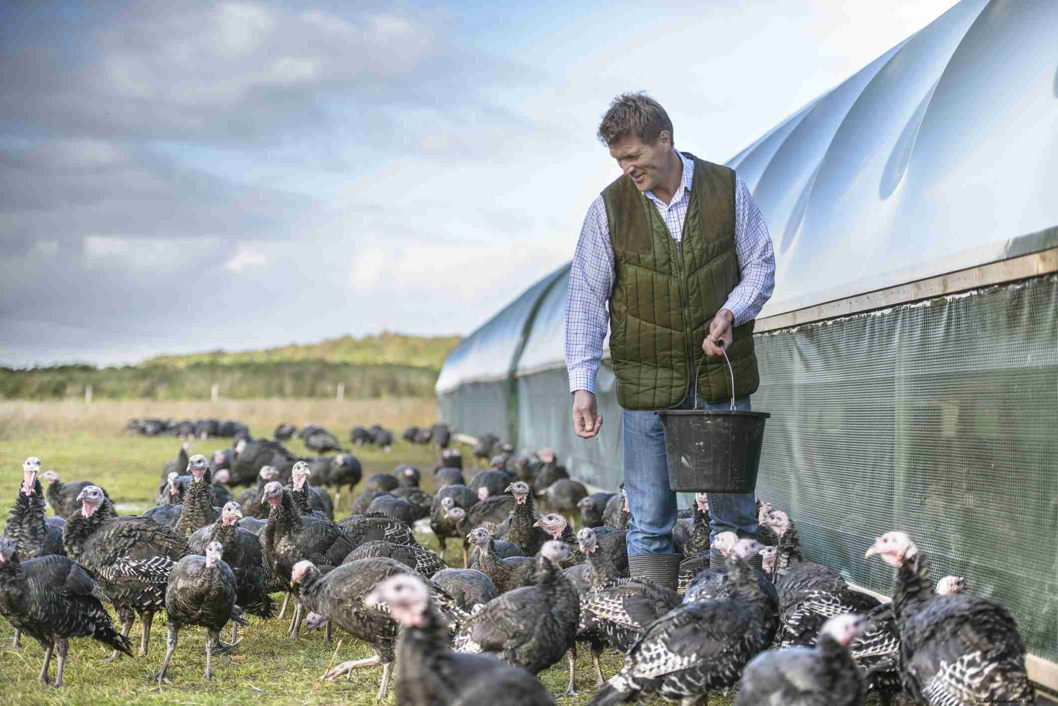 Stock up on the supplies you'll need to feed and water your turkeys. For a dozen turkeys, you'll need at least 2 gallons of water every day, so consider an automatic waterer connected to your outdoor water spigot. A four-foot-long waterer will suffice for 12 birds. Many turkey farmers build a wooden range feeder with a little roof on top to hold the feed. A feeder that holds about 100 pounds of feed is a good size for 12 turkeys, as by the time they near maturity they will each eat a pound of feed a day.