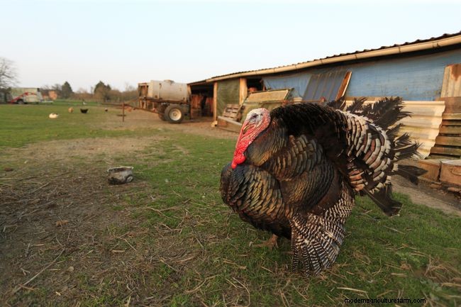 For breeding, a more solid, permanent turkey house can work well. Divide the enclosure into at least two separate spaces to keep toms and hens separate. You can let out toms for a few hours every day to graze, then let them back in before letting the hens out to graze. Coax the birds back into the turkey house by offering them poultry feed. Even for breeding stock, make sure the turkeys have access to pasture each day. About half of an adult turkey's diet will be made up of grass and plants from pasture.