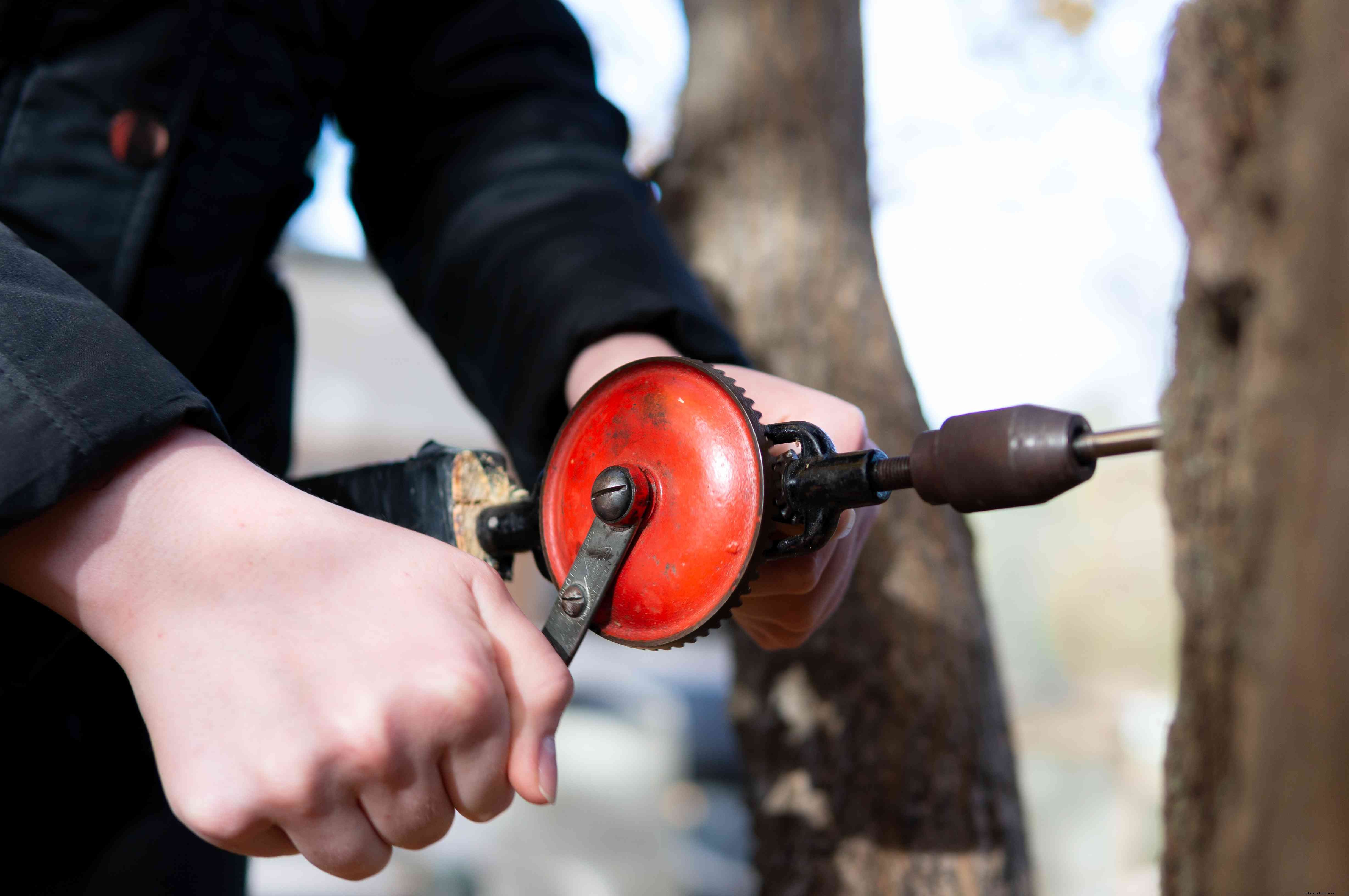 Tapping is about as easy as it sounds. You can place taps anywhere on the tree trunk but think about ease of collection and the height of any (potentially melting) snow. Two to four feet off the ground is about right. Drill the hole, slanting it upward slightly so that sap can run out, then insert and gently tap the spile into the hole. Hang the bucket or bag onto the spile to collect the sap.