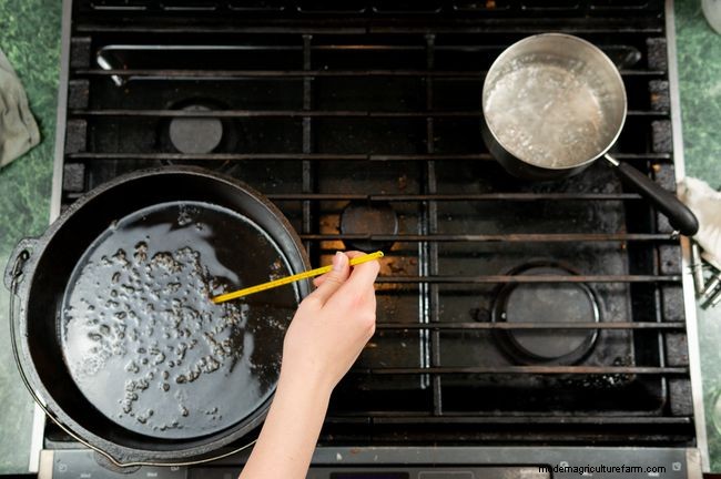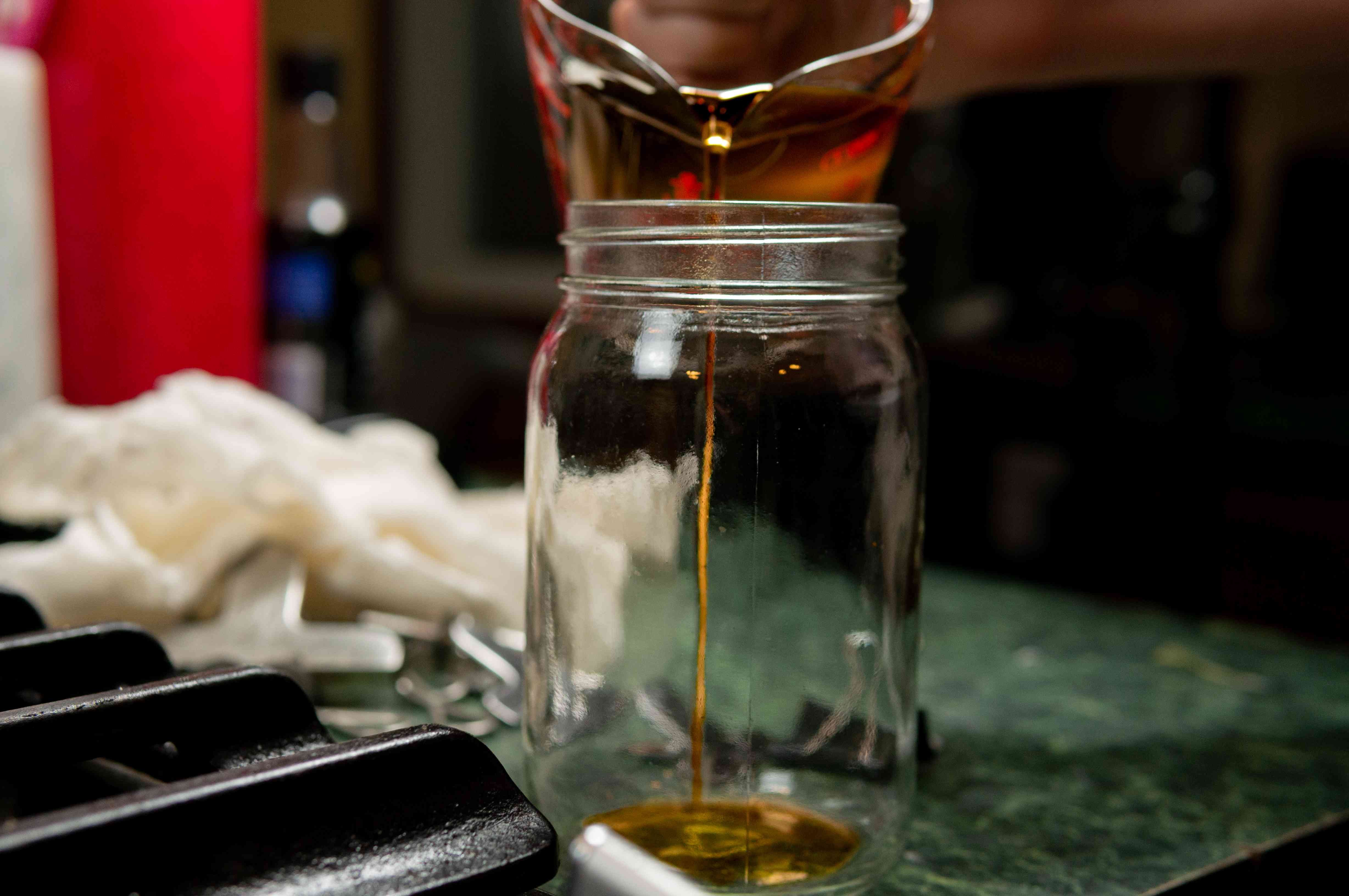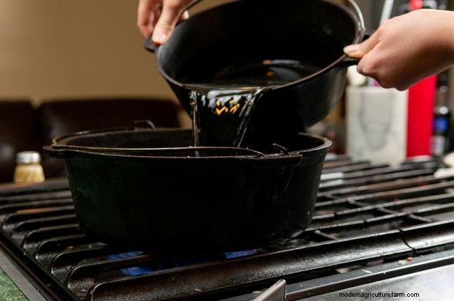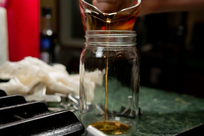 When you're done evaporating all your sap and ready to finish, continue to evaporate what's left while monitoring the temperature carefully. When the syrup is boiling at 7.1 F above the boiling point of water, filter and package the syrup. If you are using a hydrometer, check the density of the syrup before pouring into containers. For safe storage, be sure the syrup is at a minimum temperature of 185 F during pouring. After pouring and sealing, turn the containers upside down for a few minutes so that the container neck and lid bottom are covered with hot syrup, then turn right side up again.