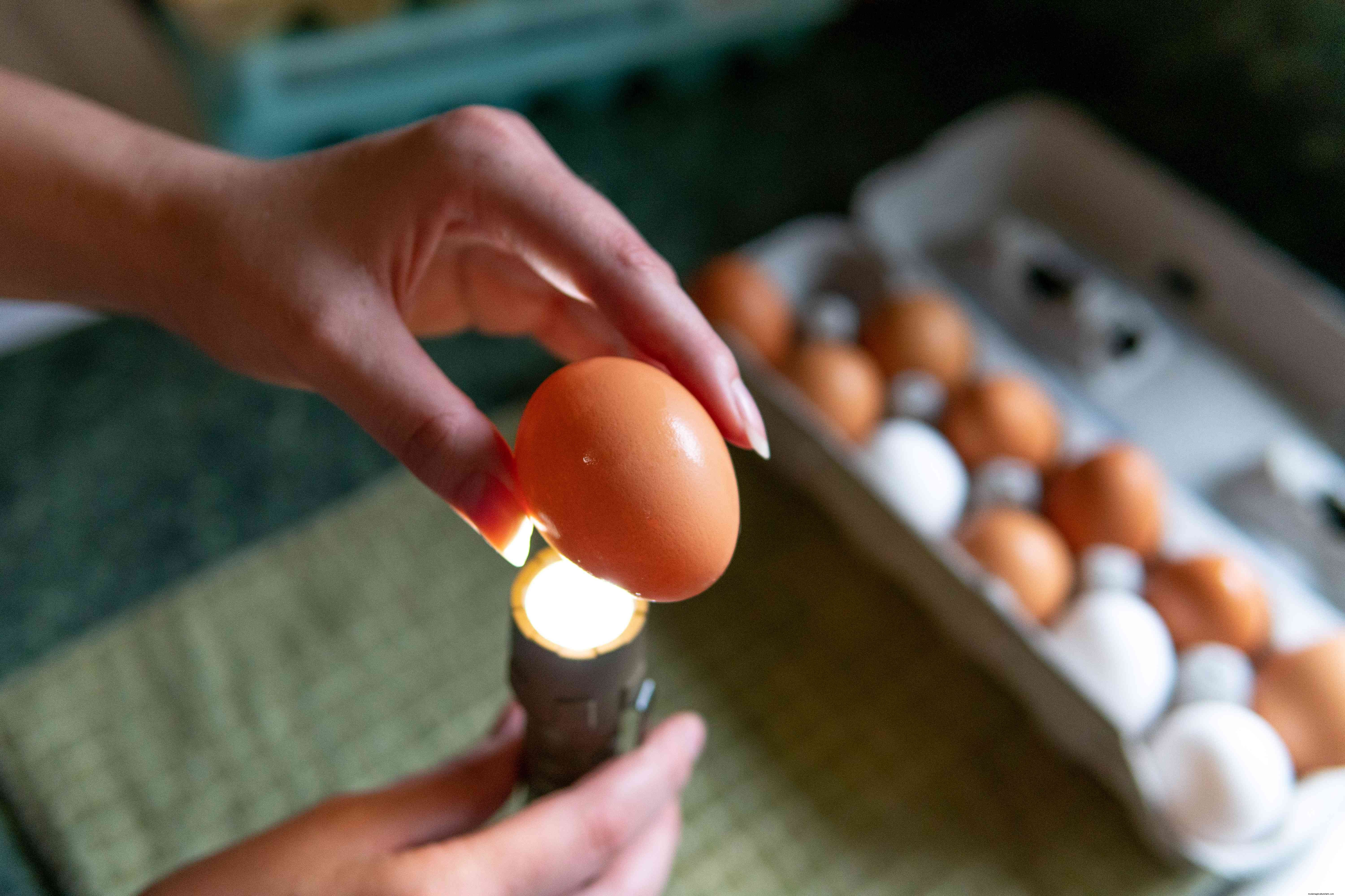 Next, inspect the egg interior by candling. Candling involves holding a light up to an egg to see the inner contents. As an egg ages, the air sac inside it gets bigger as its contents shrink. Higher grade eggs have a very small air cell.