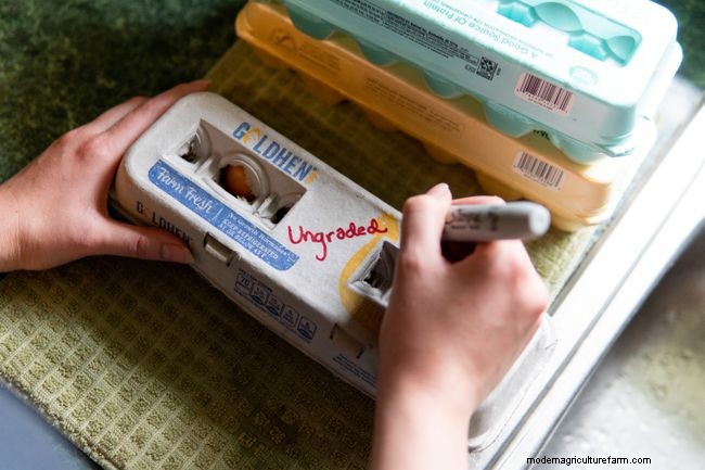 In some states, you must use brand-new egg cartons to package the eggs you sell. In other states, clean containers can be reused. For example, at my local recycling station, people drop off used egg cartons for farmers to use. There is always a good supply of egg cartons available. Also, check your local cooperative grocery store or farmers market for extra egg cartons. Depending on the law in your state, you may need to label your eggs "ungraded" and you may need to include your name, business name, address, and the date the eggs were collected. If you are grading eggs, you may need to label them with the grade and size.