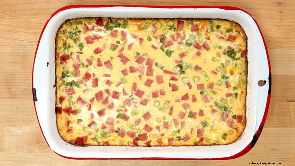 Once again a great meal for those of you who love to combine eggs into your meal and make them delicious for any farmer! Farmer’s casserole is a simple dish that needs a simple preparation and it’s done in just a few simple steps. For this farmer’s breakfast, you need 3 cups of frozen shredded hash brown potatoes, ¾ cup of shredded Monterey Jack cheese, 1 cup cubbed fully cooked ham, ¼ cup of chopped onions, 4 large eggs, 1 can of evaporated milk, ¼ teaspoon pepper, and 1/8 teaspoon salt.