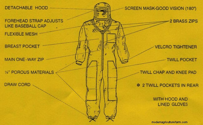 The Golden Bee Suit means business. It’s ventilated, “virtually sting proof,” flame retardant, equipped with chap and knee pads, made in the U.S., tested “successfully” on Africanized bees, and are made to order.