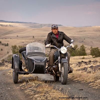 John Mionczynski on his motorocycle with sidecar, sans goat.