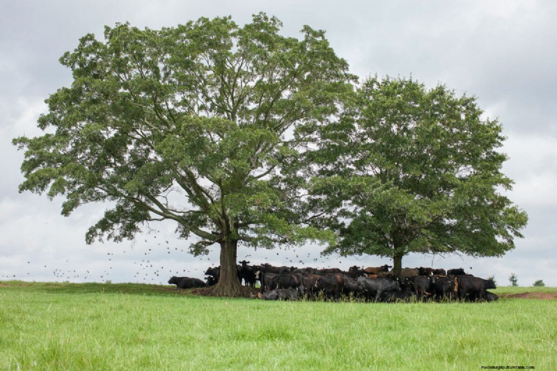 Toward the end of a long day, Harris drives the Wrangler into a tree-ringed pasture across the highway from White Oak’s sheds and slaughterhouses. There are half-grown cattle scattered across the small field, glossy black like Angus but possessing the mahogany glint of Japanese Akaushi and sometimes the dove-grey burnish of Charolais. The sunset light slides under the branches and turns the humid air pearly. Harris kills the engine. The cows, noses deep in red-flowering clover, stop munching and look up.