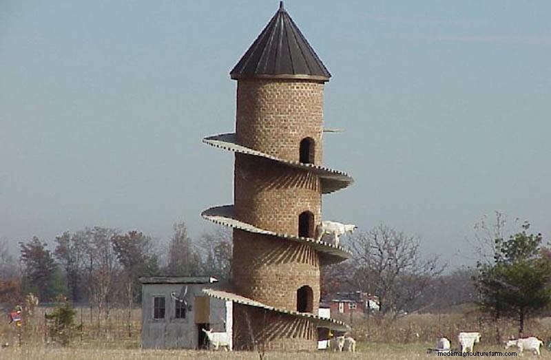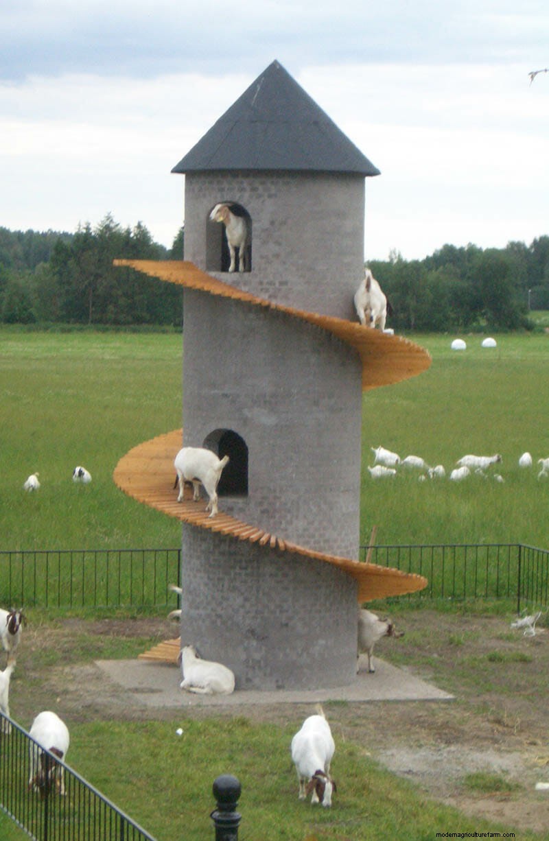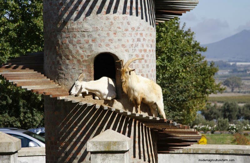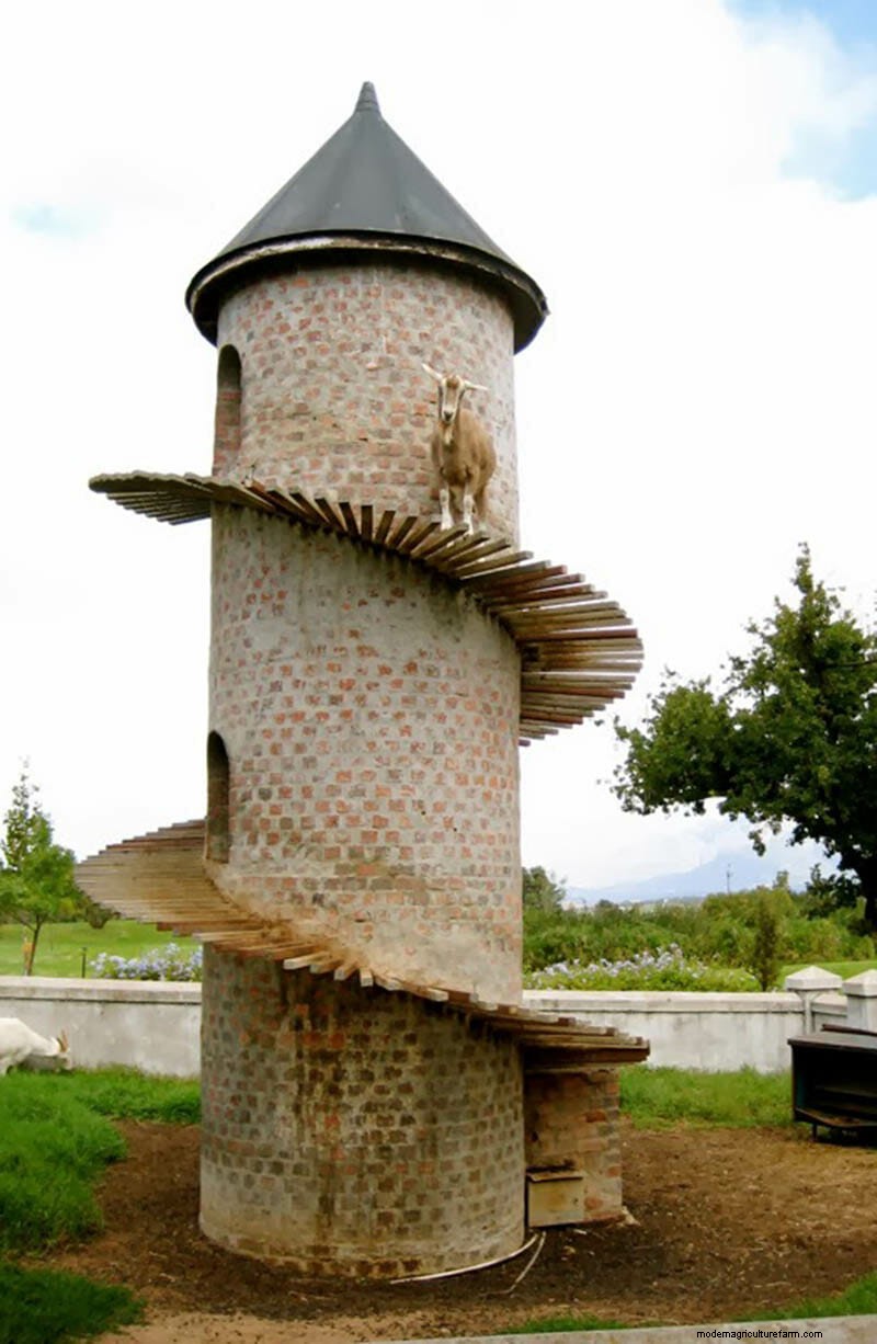 No one recognized the brilliance of his idea for about a century, when Charles Back decided to build a goat tower of his own at Fairview Wine and Cheese in South Africa in 1981. The tower now serves as a playground for the 750 Saanen milk goats at and has also become of the most identifiable aspect of the Fairview brand.