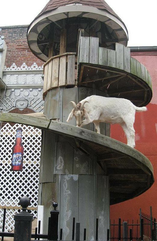 Last but not least, Silky O’Sullivan’s bar in Memphis, Tennessee has also jumped on the goat tower band wagon for the amusement of both their patrons and their goats. The goats there might be having a bit having a bit too much fun. One blog post at Atlas Obscura reports that customers let the goats have a sip or two of their beers before the animals climb the tower.