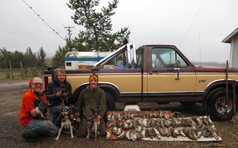 Reed was raising poultry when he got his first terrier to scare predators away from his flock. Without prompting, the dog started snatching up rats attracted by his birds. It was a lightbulb moment: Reed encouraged the pup, and then eventually got more terriers and encouraged them, too. Soon, the Mongrol Hoard was born, and he started hiring himself out to local farms. He charges a small fee for his services (between $50 and $75, plus “a box of beer”) and won’t return to sites where famers aren’t willing to change their habits in order to discourage rats. Hunts typically last 3 to 4 hours and he usually enlists help, including the farmer, to move around pallets and other good hiding places. His record is 121 rats in three hours, he says. Dead rats are vulture food – collected, but left out for the prey birds to eat.