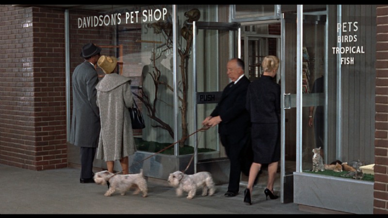 Alfred Hitchcock strolls through an opening scene of 'The Birds' with his Sealyham terriers.