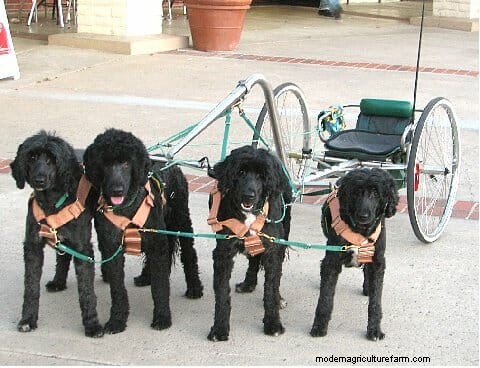 A team of Portuguese Water Dogs hitched to a dog cart. / Photo by Darlette Ratschan.