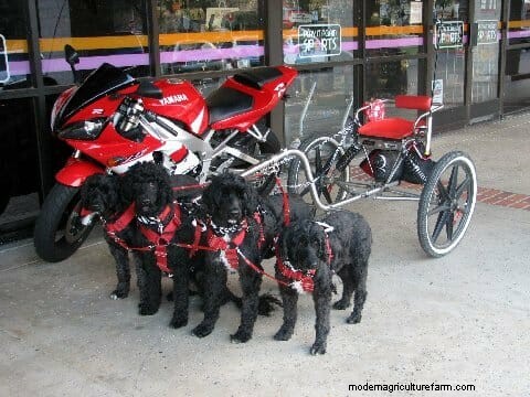 Dog driving is best suited for larger, working breeds such as German shepherds, Swiss mountain dogs, and Saint Bernards. A typical cart can weigh between 25 and 45 pounds, plus your own body weight. The golden ration between what a dog can pull over long distances and his own body weight is 3:1. But before you go on a diet to lighten Fido’s load, here’s another option: just add more dogs.