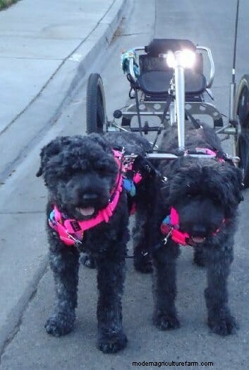 A pair of Bouvier des Flandres wait to take their master for a spin. / Photo by Darlette Ratschan.