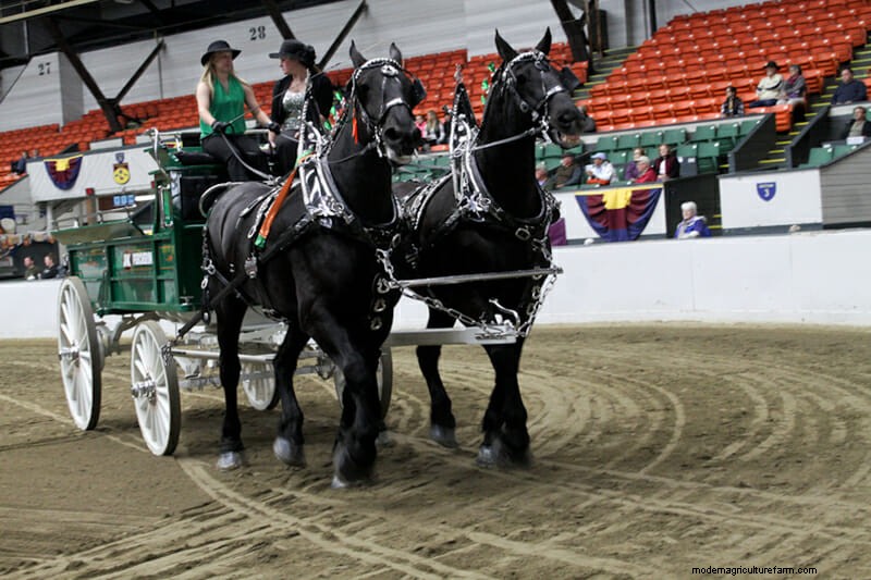 Megan Bunnell (L) and Rebecca Palmer compete with percherons Mike and Murphy at this year’s Congress.