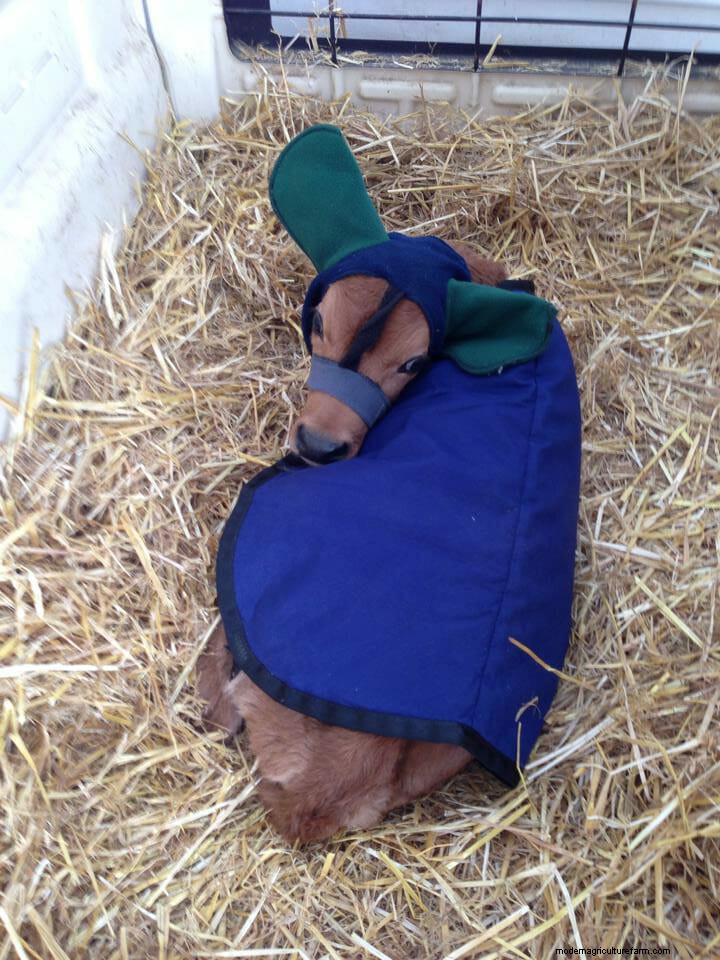 Though most mature cows can handle a little snow, newborn calves are a sensitive bunch. Because no one likes frostbite, many farmers use specially designed hats to keep those big bovine ears warm.