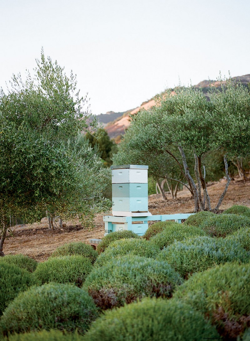A Langstroth hive, the industry standard, sits amid lavender and olive trees in the Napa Valley.
