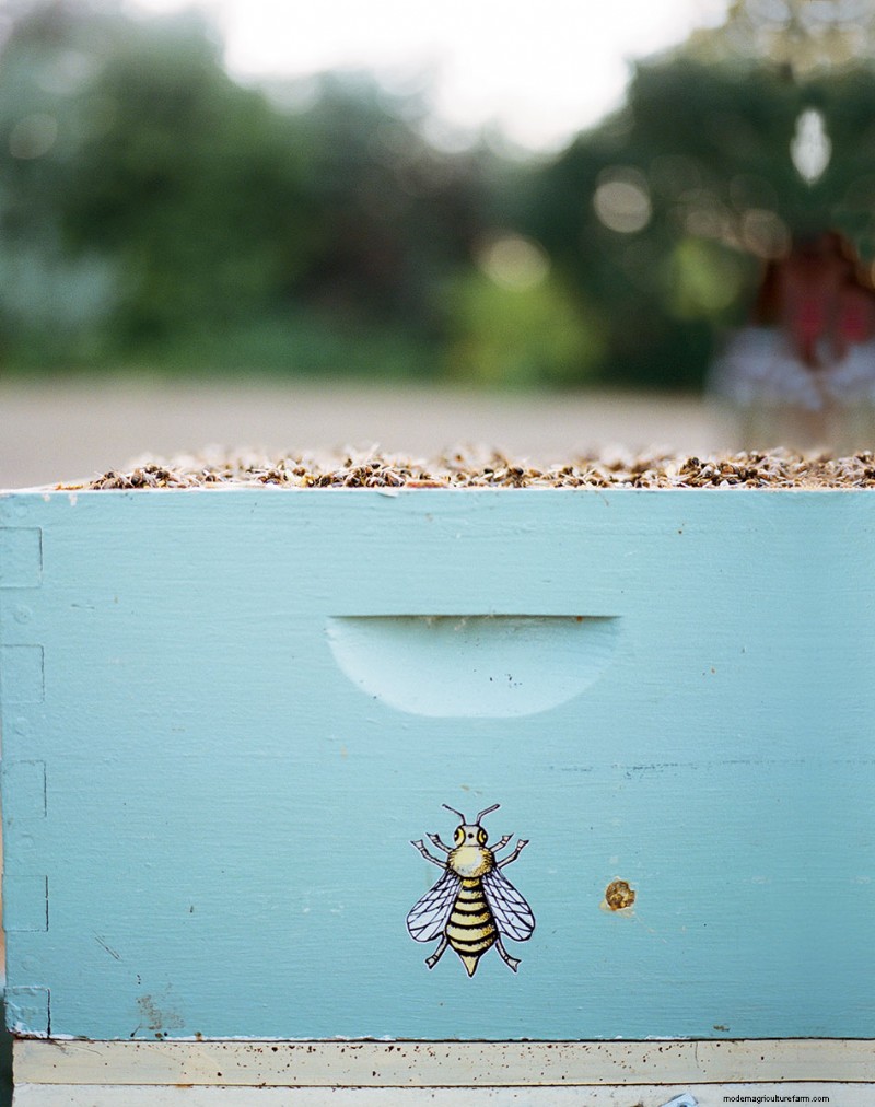 Buzzing with activity, this brood chamber bears a sticker that Keller – an artist before becoming an apiarist – designed with a friend.