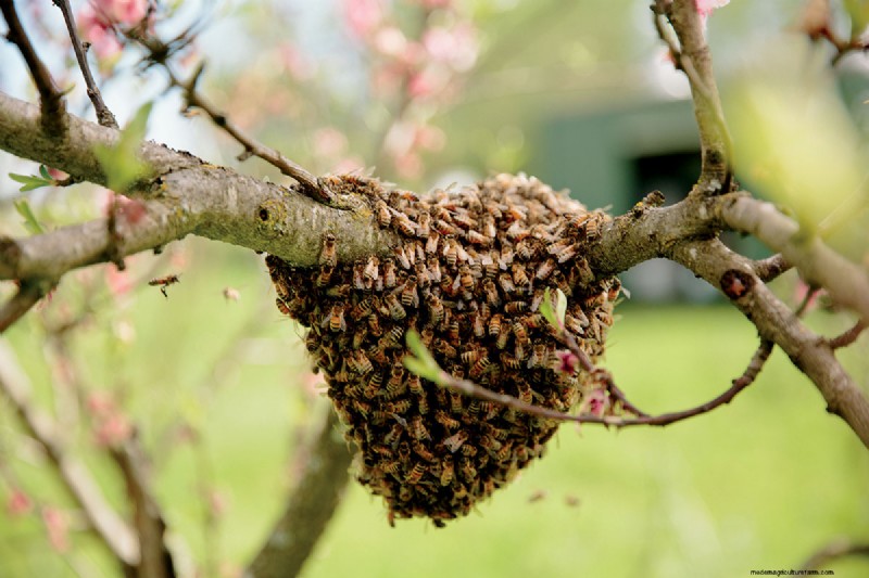 Once a colony has outgrown its hive, the queen will depart with part of her posse to search for a new home. This mass exodus, known as a swarm, can be forestalled by providing plenty of brood space. Keller often catches swarms on the loose and hives them up.