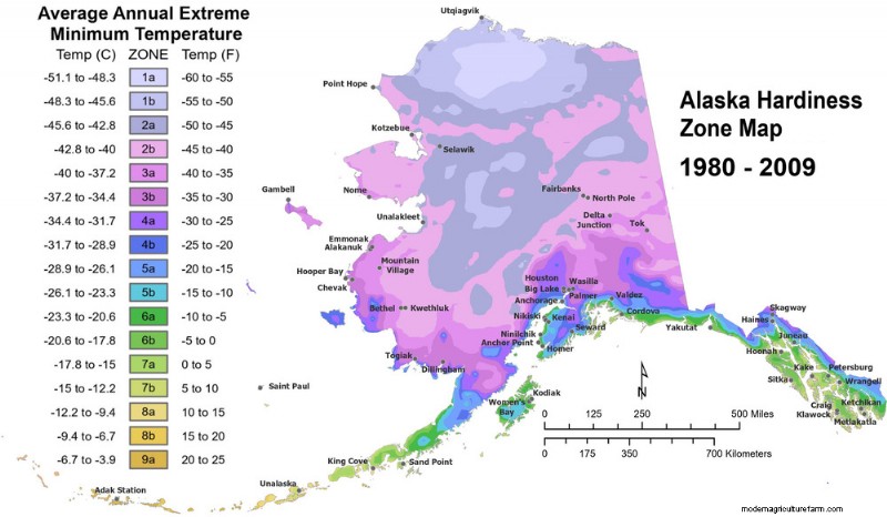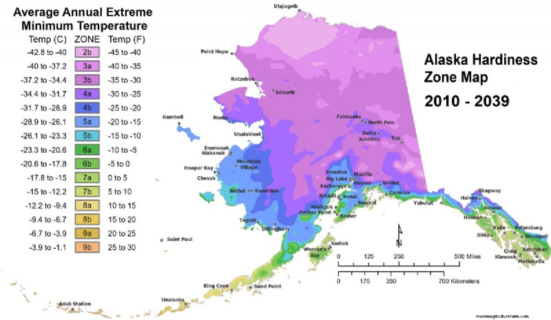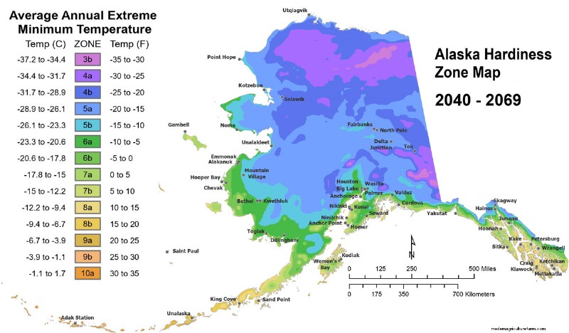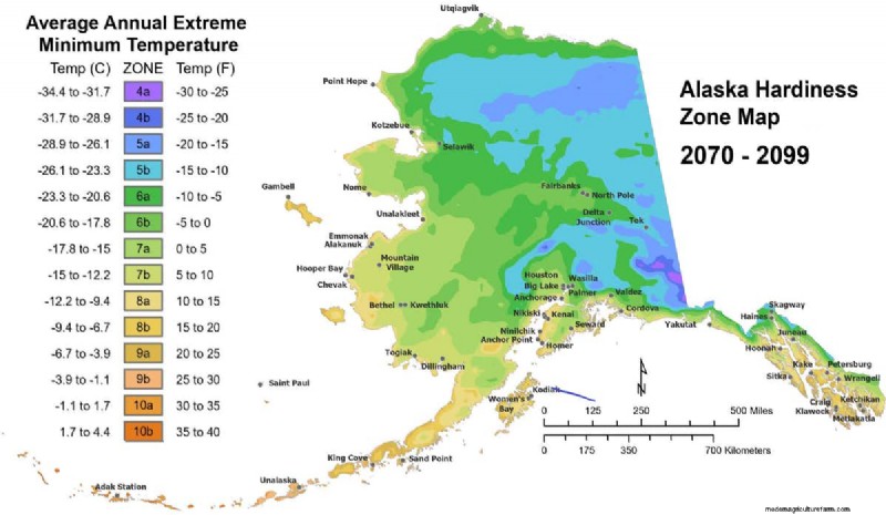 We’re also likely to see huge changes in potential perennial crops because of our loss of winter chill. Many gardeners are familiar with USDA Plant Hardiness Zones, which are based on the average coldest winter temperature for a given area. Using the same categories as the USDA, we projected Alaska Hardiness Zones.