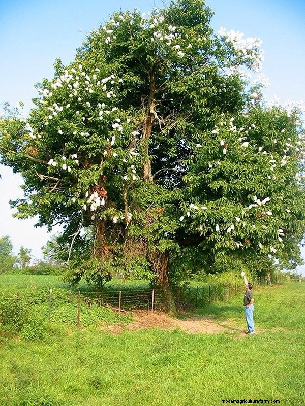 A man is dwarfed by a large surviving American chestnut in Kentucky. Photo courtesy of the American Chestnut Foundation.