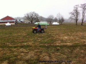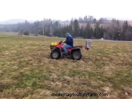 The first goal of frost seeding is to uniformly distribute 6-12 lb/ac of red clover seed on the fields in question. While there are various ways to accomplish this, the simplest is an ATV-mounted spinner spreader such as the Herd seeder sold by Kaso Manufacturing Company. If you use this type of spreader, be sure to check your broadcast pattern and calibrate so that you don’t run out of seed prematurely. If you blend red clover seed with fertilizer or other types of seed, keep in mind that each component will have a different broadcast width.