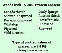 Weeds are also high quality forage, maintaining much higher levels of protein through the growing season than typical pasture grasses. Because they have a higher leaf to stem ratio than grasses, they generally have better digestibility numbers as well. A maintenance ration for cattle requires 8% protein, so when grasses dry in mid-summer and drop below 8%, weeds can provide the protein cattle need to maintain, or even to gain weight. Higher levels of protein in weeds can also provide the nutrients rumen microbes need to process lower quality forages, so we can take advantage of forage that might not otherwise have been useful.