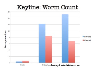 There was an average of 27 endogeic and epigeic worms per square foot in the keyline plowed pastures, versus the 15 per square foot in the control. An acre has 43,560 square feet. With an extra 12 worms per square foot, there were 522,720 more worms per acre in the keyline-plowed pastures. The presence of more worms suggests faster turnover of nutrients and better aeration.