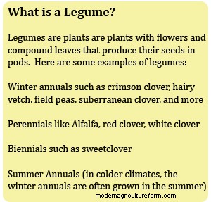 Legumes fix atmospheric nitrogen, providing a source of fertility for organic farmers, and a way to reduce costs for non-organic farmers tired of purchasing fertilizers. They are also typically higher in crude protein, and more easily digested than pasture grasses, so they add a lot to the nutrient value of pastures. Mixed grass and legumes provide higher dry matter yields than grass pastures, and maintain their nutritional value longer through the growing season.
