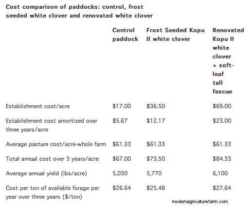 The table below shows the costs for the work that Jim Munsch did on his pastures. Costs per ton of forage for the white clover and control paddocks were similar. But the 15 to 21 percent increase in yield of the clover paddocks also translates into being able to support 15 to 21 percent more animals, or to being able to extend the grazing season by stockpiling forage. Again, the cost per ton of stockpiled feed comes in much lower than the cost of purchased feed.