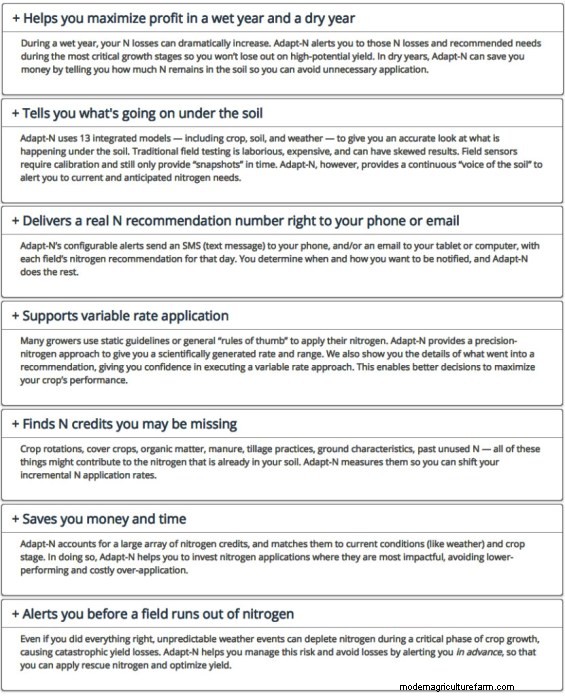 Cornell soil scientists have developed a program (Adapt-N) that models nitrogen behavior in agronomic soils. This model includes as many of the relevant variables as they have data to support, as well as historical and real-time weather data from each site studied. That means that it can model what’s happening to the soil in your field to give you a better idea of how nitrogen needs are changing and what you’ll need to get the best results possible. The table below, from the Adapt-N website, shows you what the program was designed to do. While Cornell maintains control over the evolution of the tool, Adapt-N has been licensed to Agronomic Technology Group. Depending on your scale, Adapt-N will cost about $2-3/acre this year. A recorded webinar explaining the new user interface and fee structure can be found here .