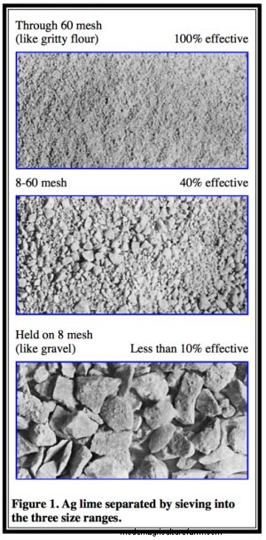Particle size is measured by the sieve or mesh size they pass through and is calibrated to the time it takes for the particles to react with your soil. For example, particles passing through a 100-mesh sieve will react 100% with the soil within 6 months. In contrast, particles passing through a 60 mesh will take a year to react 100% with the soil. Particles passing through mesh sizes of 20 will take two years to react. The label on the lime you’re thinking of buying indicates what percentage of the particles passed through the 20 and 60 mesh sieves.