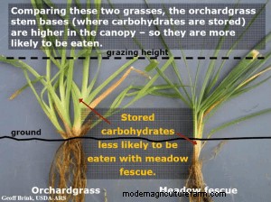 It is the jointed grasses, with non-flowering stems that will have to rely on energy stored in the roots as carbohydrates if grazed too short, and that’s easy to do. Think: timothy, smooth bromegrass, reed canary grass. Jointed grasses have growing points that move up the stem with regrowth. Grazing them shorter will have even more of an impact.