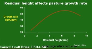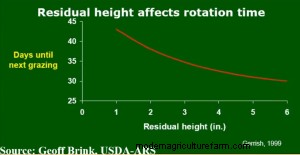Taller residual height affects regrowth rate; okay, that’s obvious.This is especially true with smooth bromegrass, and also with orchardgrass and timothy. Leaving 4″ of residue instead of 2″ means that your regrowth rate will be almost 50 lbs per acre per day, instead of just 30. In late summer and early fall, the cool season grasses put in tillers, including reproductive tillers. Severe defoliation can set things back. Knowing this, overgrazing can be used strategically in the fall to help add new species with a spring planting into an established stand.