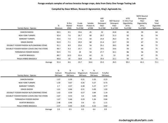 Brassica is the scientific name for turnips, and radishes. They actually have a higher protein content than many legumes, averaging 24% crude protein in our samples, and make excellent companions for sorghum-sudans and sudangrasses. (See the chart below.) Their high protein content is well balanced by the highly digestible fiber of the summer forage grass, helping slow the rate of passage and increase utilization. Brassicas don’t lignify as they mature, providing high quality forage for the duration of their growth. Their growing times also match up well.