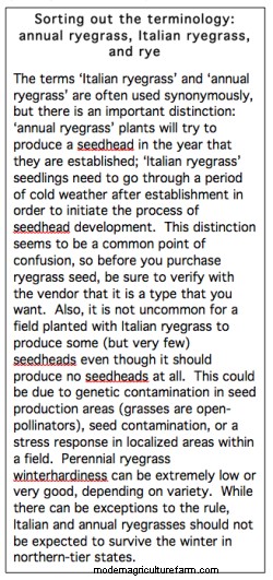 Its ability to establish rapidly and its dense, fibrous rooting system makes ryegrass useful for reducing soil erosion, reducing soil nitrate loss, and has led to an increase in its use as a cover crop in row-crop agriculture is increasing in parts of the country with more mild winter temperatures. This does not mean that Italian ryegrass is well suited as a cover crop to follow corn silage in most of the Northeastern U.S., because it is not. Like cereal rye (aka fall rye or winter rye), Italian ryegrass requires vernalization (exposure to cold weather) to initiate the reproductive stage of growth. Unlike cereal rye, many/most varieties of Italian ryegrass winterkills or have highly variable survival within and among fields.