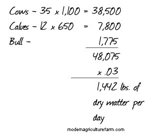 Now take inventory of any hay you have on hand. You should have an idea on how much bales weigh and how many you have of each. If you have one hundred 1,500 pound bales (1,300 pounds dry matter) on hand, you essentially have 130,000 pounds available. The efficiency of this hay is also dependent on how you feed it, plus how it is stored. The worst case scenario is hay fed free choice without any feeder structure and hay stored outside on the ground which sadly wastes about 45% of the offered hay. Feeding enough hay for only 2-3 days at a time (creating some competition between cows), in ring or cone type feeders and storing bales inside is pretty efficient with an average of about 15% waste….that is, of course assuming that the hay is good quality too. Small bales, fed in feeders, are probably the most efficient, but certainly a little more labor intensive and just not used as often as in the past. If you have silage or balage on hand to feed, figure it into the picture and generally expect 90% efficiency adjusted to dry weight.