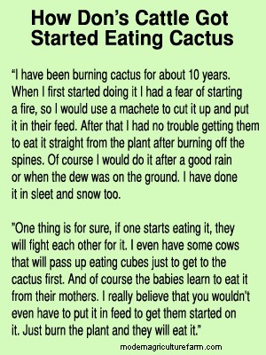 Cactus can provide at least 5 to 10% protein and is an excellent source of fiber. It should be considered a supplement and not the only source of protein. Supplementing cattle with cactus and feeding an occasional bag of feed along with hay will provide an excellent source of nutrition for both the cows and their calves. There are a lot of informative articles and research about cactus burning. I think if I ever run out of cactus I will probably plant more. It’s a good winter “crop” and not just for droughts. In fact, in Brazil, there are actual cactus plantations growing feed for dairy cows. They’ve found that a diet of 20-30% prickly pear is optimal for milk producing dairy cattle, and for beef cattle up to 60% of their diet could be prickly pear as long as they were supplemented with maize stover and molasses urea. And the cattle love it, choosing cactus over other feeds as shown in the video below: