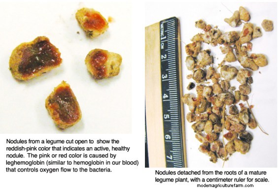 When the nodules are young and haven’t started fixing nitrogen yet, they are white or gray inside. Once they’re working they will be larger and will gradually turn pink or reddish in color. When they’re no longer fixing nitrogen, the nodules turn green and may even be discarded by the plant.