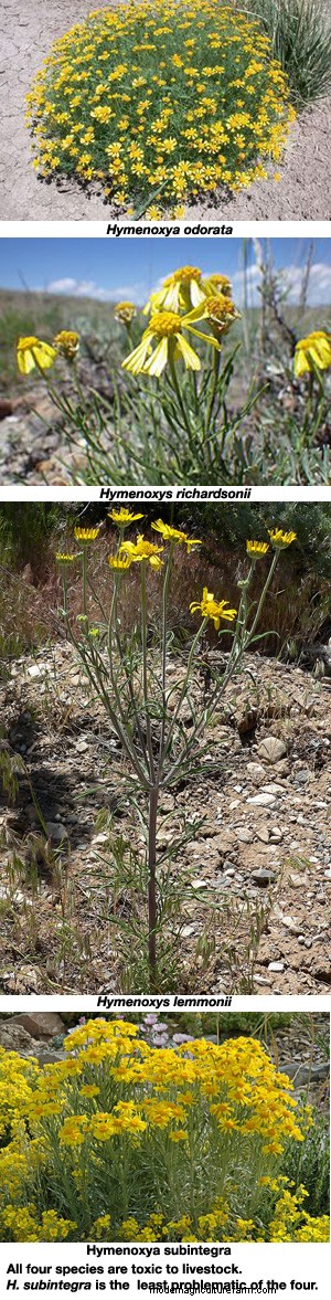 The effects of the toxins in this plant are cumulative so animals can become poisoned by eating a lot of the plant rapidly, or by eating smaller amounts over a long period of time. As little as .1% of bodyweight eaten daily can produce chronic symptoms in 44 days. Burrows and Tyrl say, “Depending upon the rapidity of plant consumption, three forms of the disease are observed. Relatively uncommon, the acute form causes severe clinical signs and death in 24-48 hours. In the more common subacute form, signs are less severe and death occurs in 4-15 days. In the third, more chronic form, there are few distinct clinical signs, but eventual death due to starvation and dehydration is seen when small amounts of Hymenoxys are consumed over a prolonged period of time.” (1)