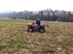 6. The broadcast seeder is correctly calibrated. Red clover should be spun on at 3-4 lbs/A if frost-seeded every year, and 6-8 lbs/A if every other year or a first-time seeding. White or ladino clovers go in at 1-2 lbs/A, and are longer lasting, so they won’t need an annual reseeding.