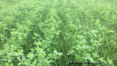 Usually, perennial grasses serve as the primary component in pastures for grazing. Most polyculture systems add in annual species because of their flexibility and low cost of establishment compared to their perennial counterparts. Using legumes (clovers, alfalfa, and peas) can increase protein and nutrients in the available forage. Including legumes also supplies the plants in the pasture with naturally produced nitrogen fertilizer.