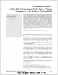 Franzluebbers led a twelve-year assessment of how soils would respond to different kinds of fertilizer and different grazing scenarios on 37 acres of rolling, eroded land in northeastern Georgia. They planted coastal bermudagrass and drilled in tall fescue 5 years later to extend the grazing season from 5 months to 10 months. They looked at the effects on the soil and on forage growth of three different fertilizer treatments (inorganic fertilizer alone, organic broiler litter alone, and a mix of inorganic fertilizer and organic broiler litter). To that they added 4 different management scenarios: moderate grazing (average of 23 steers for every 10 acres), intensive or heavy grazing (35 steers per 10 acres), no grazing and letting the grass grow, and haying on ungrazed pasture.