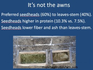 They looked at timing of grazing to see if it was the awns that prevented animals from grazing the plant. It wasn’t. They tried providing high energy supplements so that animals would be better able to process the dry thatch, but most of the supplements didn’t help. Canola meal, the only supplement that showed promise was expensive and impractical to feed on rangelands. Early experience grazing the plant alongside mom made no difference, and it was impossible to force animals to eat the grass.