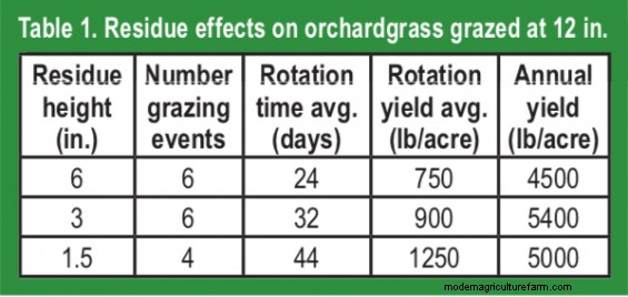 • A residue of 3-4 inches is best for pastures with tall-growing grasses (orchardgrass, tall fescue, etc.). Routinely grazing these grasses short (less than 2 inches) reduces pasture productivity, persistence, and profit.