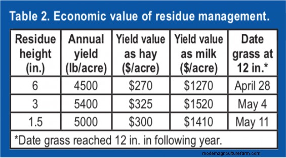 In the study, the grass grazed to a 3-inch residual had the highest annual yield. An analysis shows that this height was the most economical, too. Table 2 shows that the per acre value of the grass grazed to 3 inches is 8 percent greater than the grass grazed to 1.5 inches and 20 percent greater than the grass grazed to only 6 inches. The same is true for the value of the milk produced from that grass.