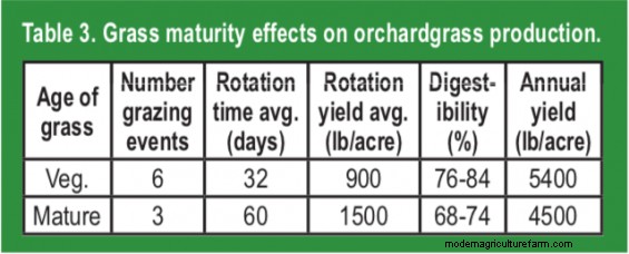 Mob-grazing (heavy stocking) of mature pasture has received a lot of attention by pasture-based producers. Some graziers like it because they feel it results in more complete utilization of the pasture. But how does it compare to grazing grass that’s in the vegetative stage, and how does it influence pasture growth? According to the results shown in Table 3, grass grazed at the vegetative stage yielded 20 percent more on an annual basis. It was also more digestible for the cattle. When grass reaches a mature stage, its yield plateaus; even though there may appear to be new growth on top of the plant, the leaves at the bottom of the plant are senescing so the yield does not increase.