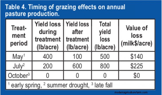 For this management treatment in the study, grass was grazed when only 3-4 inches tall in the fall before a frost event. This grass was compared to grass grazed at a normal height of 12 inches. It was found that this grazing management had no impact on pasture productivity the following year (Table 4).