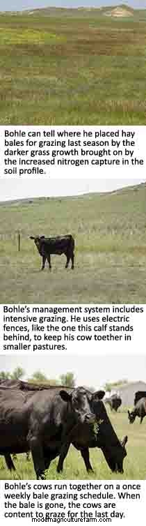 To increase the nutrients in the soil for microorganisms—“the little herd,” as Bohle calls them, Bohle has implemented a management system that includes intensive grazing, bale grazing, and growing cover crops.