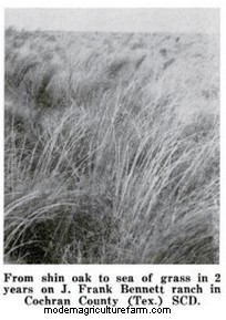 J. Frank Bennett, rancher in the Cochran Soil Conservation District, reports his range output has more than doubled since he controlled shin oak brush and reseeded 5,606 acres to adapted native species. J.L. Stuart, in the Lipscomb Soil Conservation District, had a similar observation: