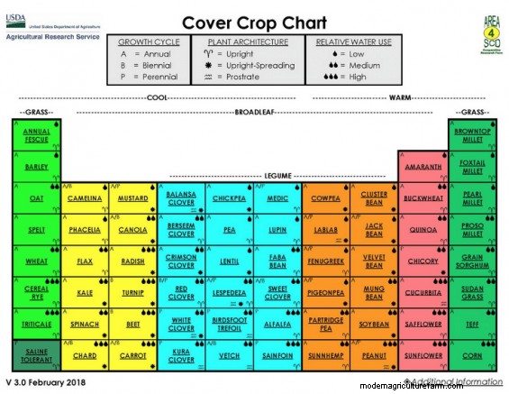 Mixing warm season and cool season plant, broad leaf plants and grasses, and adding legumes, are all ways do provide diversity, as well as resilience. Buz notes that different plants to better at different times, so having a diversity of species ensures that there will always be something covering the soil. For those of us interested in choosing diverse cover crops, he shares this chart, developed by the Agricultural Research Service’s Dr. Mark Liebig.